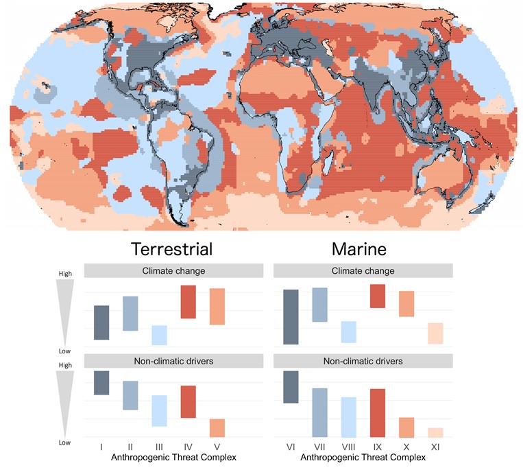 An important step in assessing which species are most at risk of extinction is determining which places are most affected by human activities. Environmental changes caused by harmful human activities are often grouped as climate change, habitat loss, exploitation (e.g., hunting and fishing), pollution, and spread of non-native species. In this study, we examined maps of the intensities of these human-caused environmental changes across the world. We analysed the spatial relationships among the intensities of these environmental changes to identify which were most associated with each other. We found that places exposed to one type of change (e.g., habitat loss) also tend to be exposed to another (e.g., non-native species). These associations were especially common on land and along coastlines. Places with the highest intensities of multiple threats were temperate broad-leaf and mixed forest (e.g., in western and central Europe) and the central Indo-pacific. Places with the lowest intensities of multiple threats were the boreal forest and the South Pacific. On land, climate change was relatively independent – but areas of high climate change (such as deserts and northern habitats such as the tundra and boreal forests) are less likely to have other types of environmental changes. From our analysis emerged the concept of an ‘Anthropogenic Threat Complex’ or ATC that represents a distinctive set of environmental changes. We grouped the entire surface of the world into 11 ATCs that can be used to guide future studies on the interactive effects of different types of environmental changes by identifying the changes which overlap, and where these changes are most intense. Our study also supports the development of research synthesis and joined-up conservation policy among regions of the world exposed to the same types of environmental changes.