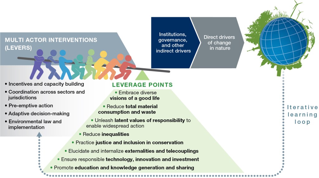 Transformative change towards sustainable pathways requires more than a simple scaling-up of sustainability initiatives—it entails addressing these levers and leverage points to change the fabric of legal, political, economic and other social systems. These levers and leverage points build upon those approved by 132 member nations within the Global Assessment’s Summary for Policymakers, with the aim of enabling diverse scholars and leaders in government, business, and civil society to spark transformative changes towards a happier, fairer and more sustainable world.