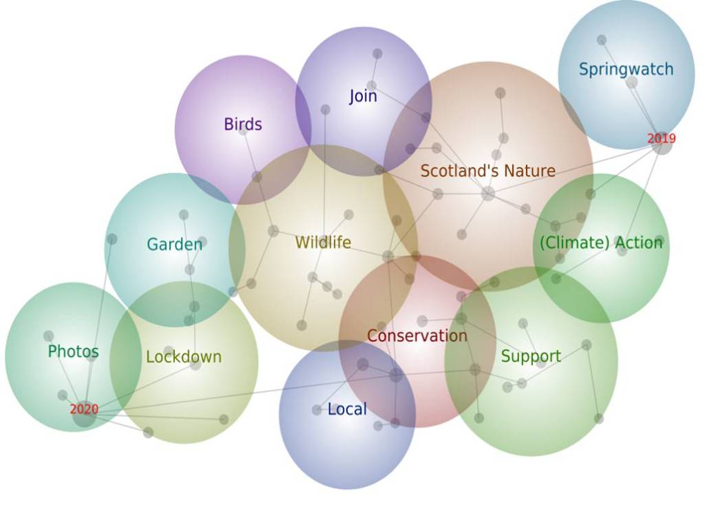 Social media – with over 4 billion users worldwide – have become widespread means of communication. Social media do not only provide platforms for sharing personal stories, experiences, and opinions, but also influence what we do and talk about. In the first COVID-19 lockdown in Scotland in 2020, physical access to outdoor spaces was substantially restricted. Direct engagement with nature was limited, yet online engagement was not. This offered a unique opportunity to examine the kinds of engagement with nature that are promoted on social media. To do so, we investigated social media communication of nature conservation and outdoor organisations by analysing tweets of four prominent NGOs in Scotland.