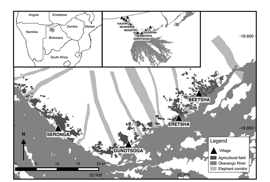 Therefore, in our recent study, we ask farmers to identify the reasons they use – or do not use! – mitigation methods. In this way, we tried to learn from them how they can be empowered to protect themselves and their fields from elephants with external support. Working together with a team of Botswana community officers, we used an ethnographic method that minimised us directing the results of the study, and allowed for farmers to identify their reasons in their own words. We first asked farmers across four villages in the eastern panhandle of the Okavango Delta in northern Botswana what methods they use and why. This is an area of just over 8,000 km2 where around 18,000 elephants and 18,000 people share space and resources. Afterwards, we used the farmers’ answers to test if we could predict, based on their characteristics and experiences, what methods they used and what methods they did not use. We managed to do this for 14 of the 16 methods mentioned, and grouped the different reasons farmers were motivated to use the methods, eliminated using the methods, or were constraint in using the methods.