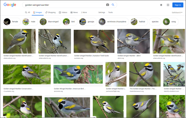 For example, what color do you think a Scarlet Tanager is? Red? No, half of the population is green, and even the male red ones are only red during the breeding season. Our perception of Golden-winged Warblers is similarly narrow: Google image search ‘Golden-winged Warblers’ and 13 of the top 15 results are showy males—see image below.