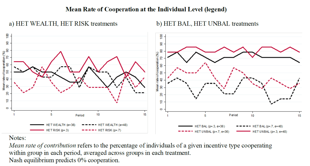At the individual level, people in all types of groups were less likely to cooperate as their individual risk of harm increased, but their level of wealth influenced the role of risk in their decision-making. Also, low-income individuals facing a high risk of loss were more likely to cooperate than were high income individuals facing the same high level of risk.
