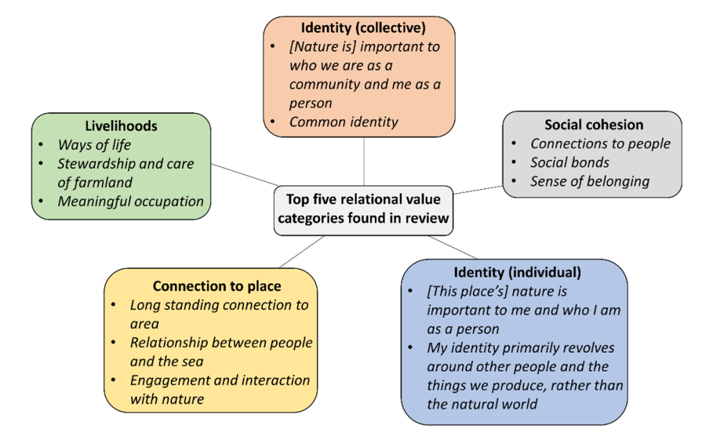 We also summarized what scholars identified as relational values. We identified 312 unique words or phrases identified as relational values, which we grouped into 17 different categories. Relational values most commonly fell into the following categories: