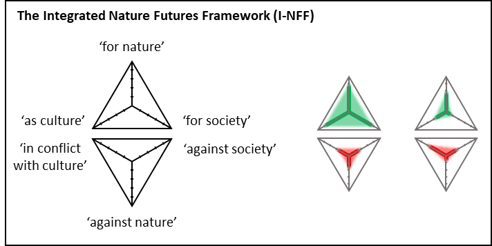 Therefore, this paper proposes such a framework. This framework draws on the popular Nature Futures Framework (NFF) to develop disvalues thinking in a more accessible form. We refer to it as the ‘Integrated Nature Futures Framework’ (I-NFF), where ‘integrated’ indicates the consideration of positive as well as negative values. The I-NFF considers three perspectives, ‘nature’, ‘society’, and ‘culture’. Based on these perspectives, nature-related matters can be characterised on a spectrum from positive (‘for nature’, ‘for society’, ‘as culture’) to negative (‘against nature’, ‘against society’, ‘in conflict with culture’). The framework, thus, takes the shape of two mirrored triangles.