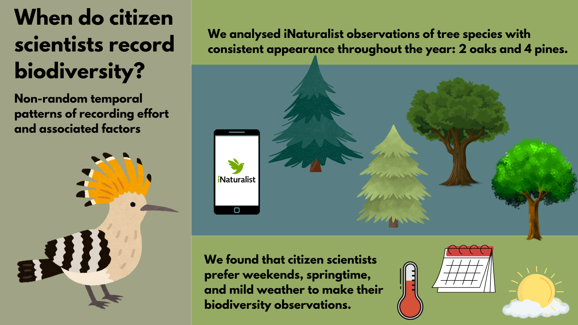 To explore when citizens are most likely to record nature, we studied six tree species in the Iberian Peninsula with minimal seasonal changes in appearance. These trees acted as a benchmark: since their appearance stays consistent throughout the year, variations in their observation numbers should primarily reflect changes in overall citizen scientist activity. We analyzed how calendar factors (for example, weekends, holidays) and weather conditions influenced recording patterns. Our findings showed that citizens recorded most frequently on weekends, Fridays, and during spring. Adverse weather, such as extreme temperatures, rain, or strong winds, were also associated with reduced recording activity, while public holidays and snow had little impact.