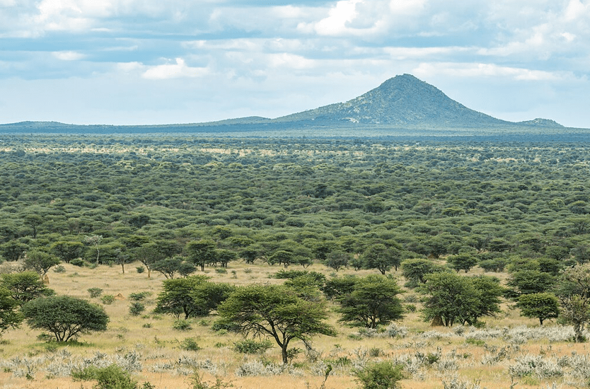 Woody encroachment is a phenomenon whereby shrubs and trees spread into grasslands as depicted by the image below taken in Namibia.