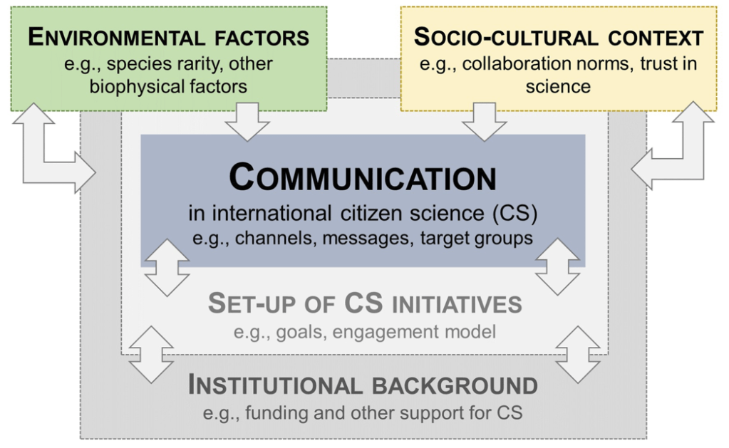 Responses showed that three key groups of factors may affect communication success in international citizen science projects. The factors affecting communications success related to: (1) local environmental conditions, (2) cultural and social context, and (3) communication support and funding. In particular, the spatial occurrence and rarity of the study species, the indigenous knowledge and traditions of citizen science, and the access to systemic moral and financial support influenced the level of public engagement.