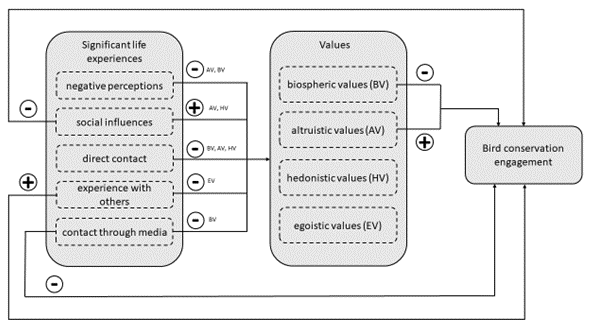 The results showed clear differences between the two groups. Bird conservationists reported more formative experiences across all categories. The strongest differences were linked to structured settings such as schools, universities, conservation organizations, and professional contexts. Bird conservationists also placed greater value on nature itself, while people from the general public placed more emphasis on enjoyment and personal benefit. When we examined how experiences and values connected to conservation engagement, an important pattern emerged. Emotionally meaningful experiences linked strongly to developing care for nature (values). In contrast, structured experiences linked most strongly to actually becoming active in bird conservation. This suggests that effective conservation efforts should combine both approaches. Experiences that build emotional connection and concern for nature need to be paired with clear and supportive opportunities for participation if care is to turn into action.