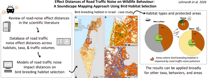 When we analyzed the potential loss of area due to the effects of road traffic noise on breeding birds’ habitat selection over the entire country of Israel, we found an alarming trend: hazardous noise pollution may negatively affect 42% of Israel’s non-urban areas, and alarmingly, 23% of the protected areas.
