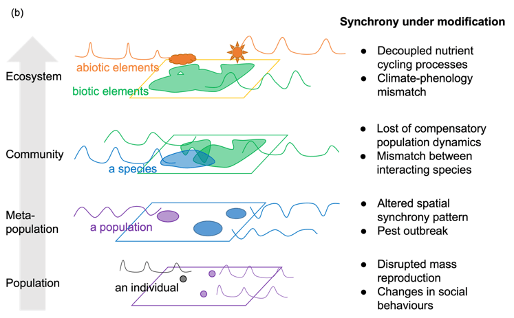 We found that human activities often unintentionally disrupt synchrony. In systems where high synchrony is needed, such as the transportation of reacting chemicals in streamflows, human disturbance can make processes less synchronized, degrading water quality. Conversely, in systems that benefit from asynchrony, such as communities where species rise and fall in their abundance differently, human actions can make them too synchronized. For instance, intensive farming and urban development often cause species to fluctuate in unison, which reduces the stability of biodiversity and increases risks like pest outbreaks.