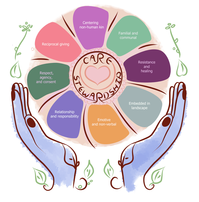 We present and illustrate a concept of care, integral to Indigenous environmental stewardship, which includes eight components: responsibility and relationship, reciprocal giving for the future, family and community connections, respect agency and consent, centering non-human kin, resistance and healing, and care embedded in the landscape. We further illustrate in the paper and demonstrate how Indigenous plant stewards live these components of care in relationship to plants and environment.