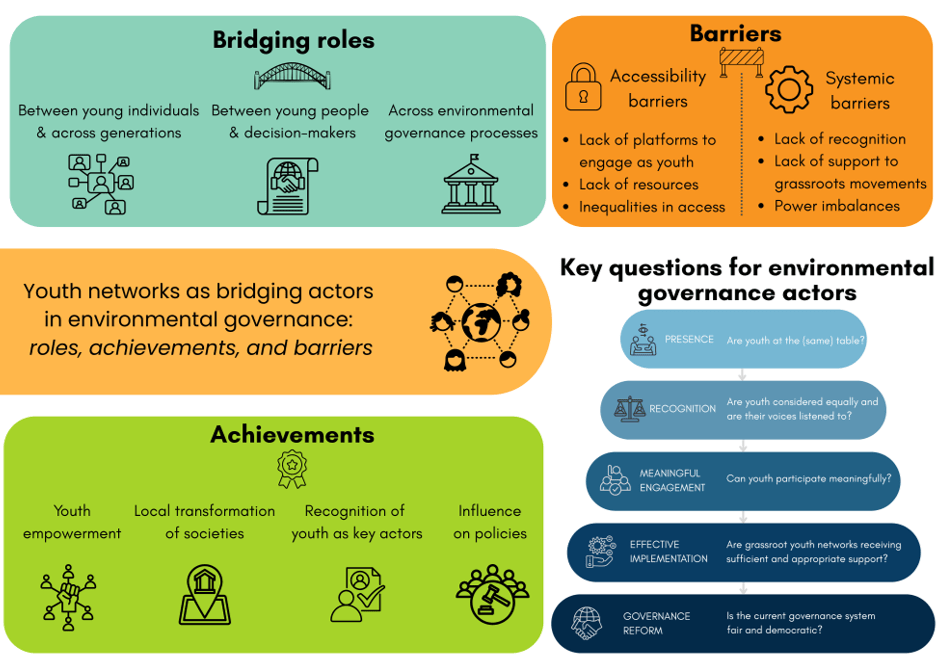 Addressing the current socio-environmental crises requires important societal changes, including in the way decisions are taken. Actors that are often marginalised in decision-making, such as young people, should be able to participate meaningfully. Despite being a major demographic group, young people are poorly represented in decision-making, as they are often not considered as political actors. To overcome this lack of participation, young people have created alternative pathways of participation, such as youth networks. These networks unite young individuals and organisations, acting together to contribute to solving societal issues and move towards a desired future for themselves and future generations. Yet, their roles in environmental governance have been poorly studied and previous research has argued that we need to adopt a youth-centred perspective to understand their contributions and achievements better.