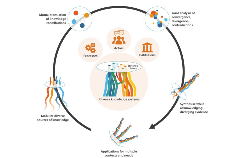 Global environmental assessments of biodiversity are increasingly bringing together different types of knowledge. Working together to create knowledge (called “co-production”) is an important way to create fair and meaningful protection for biodiversity and peoples who over time have co-existed with nature, such as Indigenous Peoples and local communities. However, there is limited guidance for how to create knowledge syntheses that includes insights from, and respect for, the various ways of knowing that exists outside of academic knowledge production.